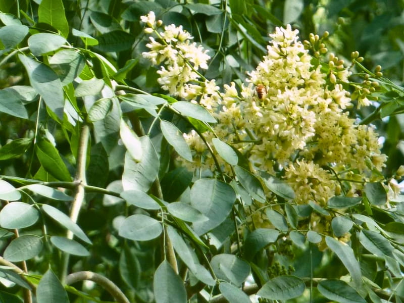 - Flowers: The flowers are the tree’s most striking feature. They are creamy white or pale yellow, pea-like in shape, and borne in large, showy panicles (branched clusters) that can be 8 to 12 inches (20-30 cm) long. The flowers typically bloom in late summer (July-August), providing a valuable source of nectar for bees and other pollinators when few other trees are in bloom. They also have a very pleasant fragrance.